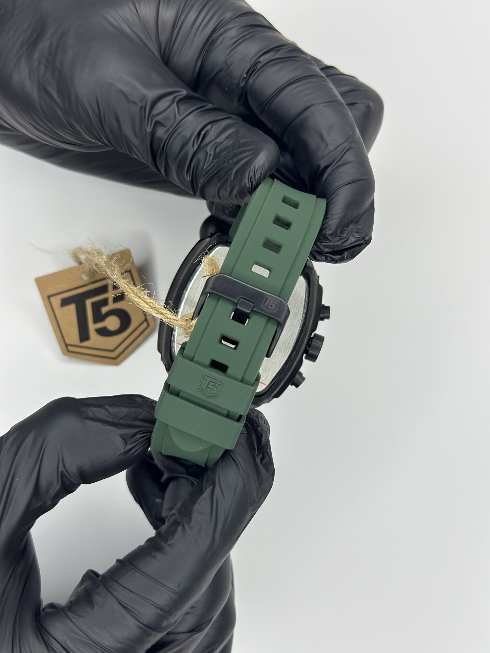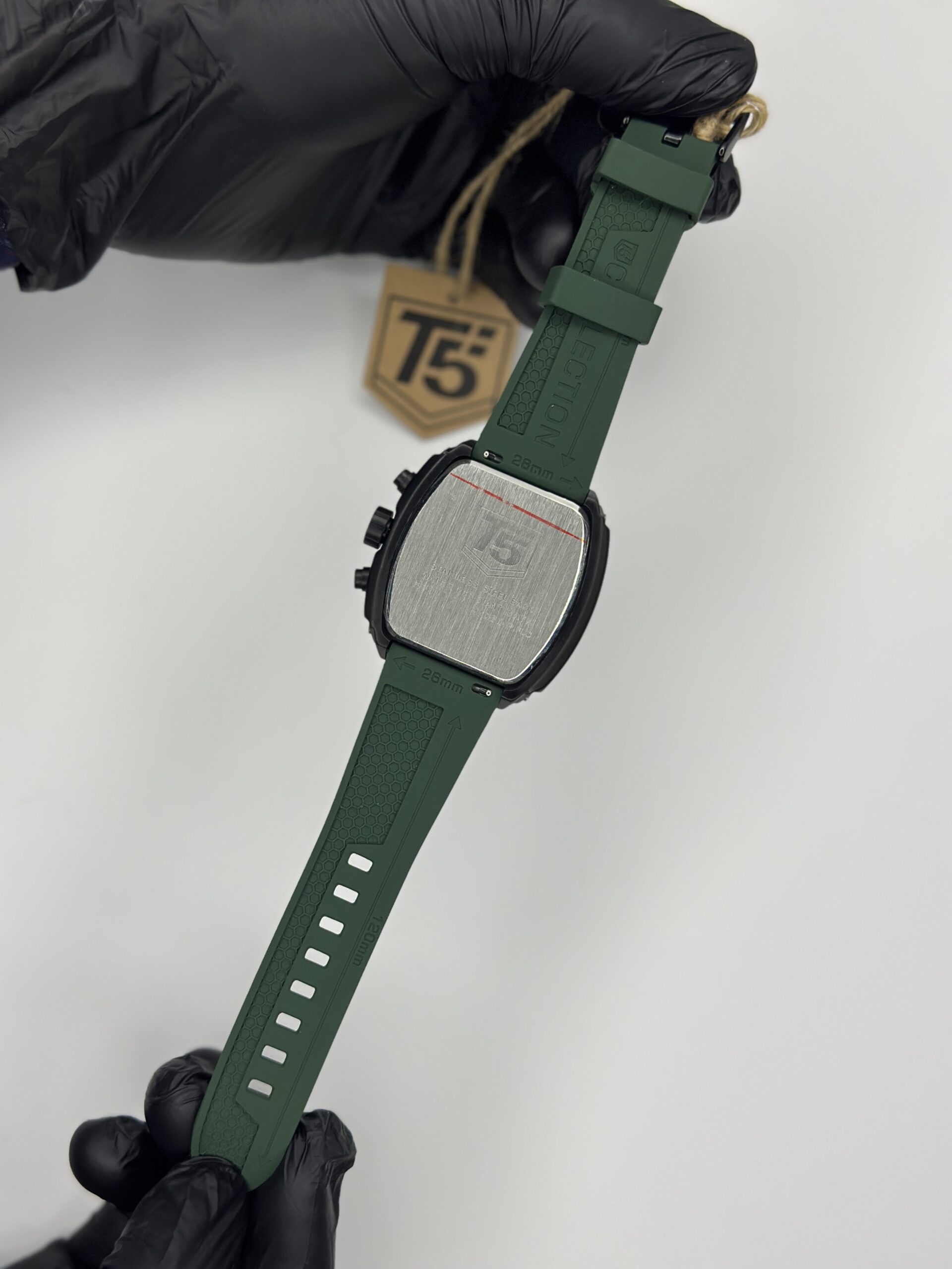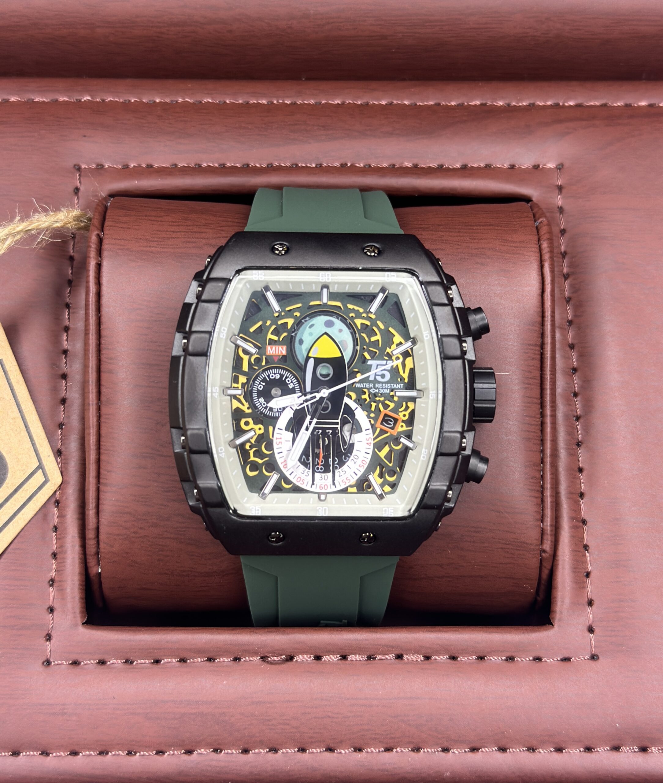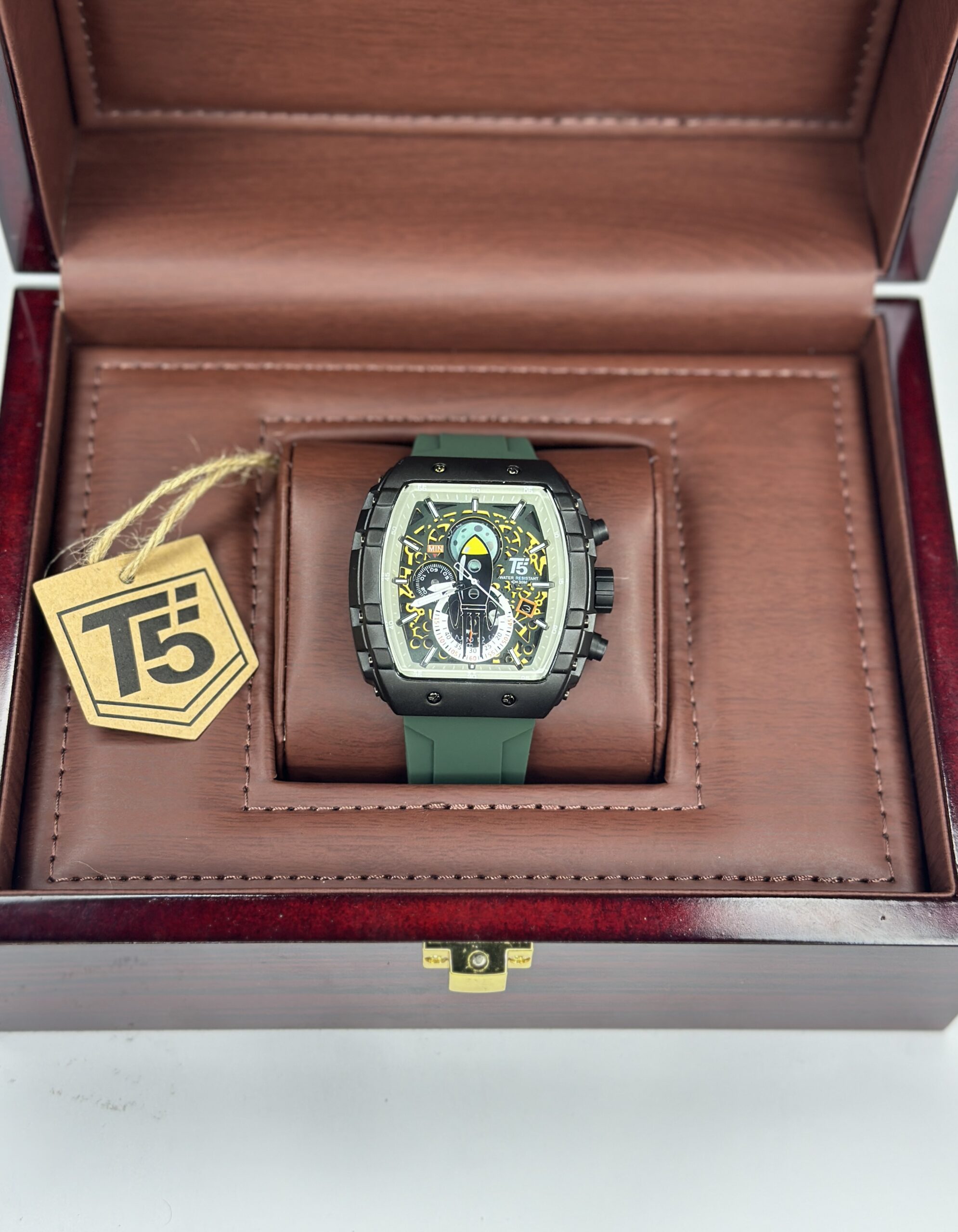 The T5 Sports Watch Moon Edition combines rugged performance with modern style. Its black metal case is paired with eye-catching green silicon straps, offering durability, comfort, and a sporty aesthetic for everyday wear.